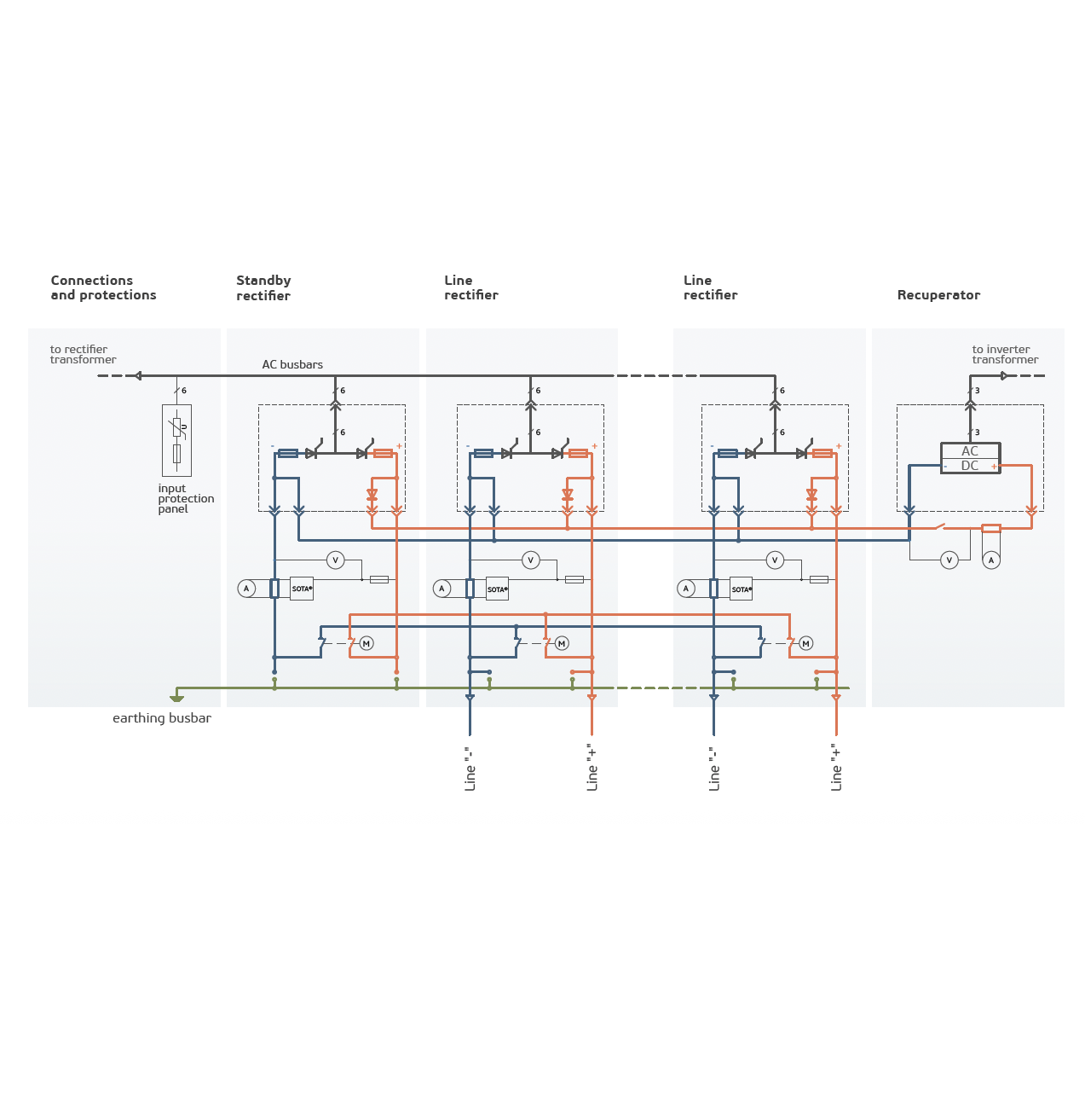 Converter transformer for rectifiers (if necessary to connect more than one transformer, it is possible to sectionalize AC busbar);